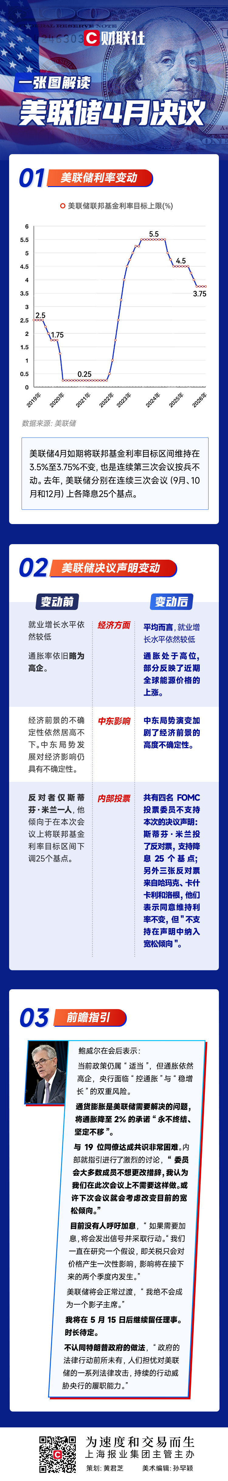 ①美联储FOMC周四凌晨如期宣布“按兵不动”,将联邦基金利率目标区间维持在3.5%至3.75%之间;
