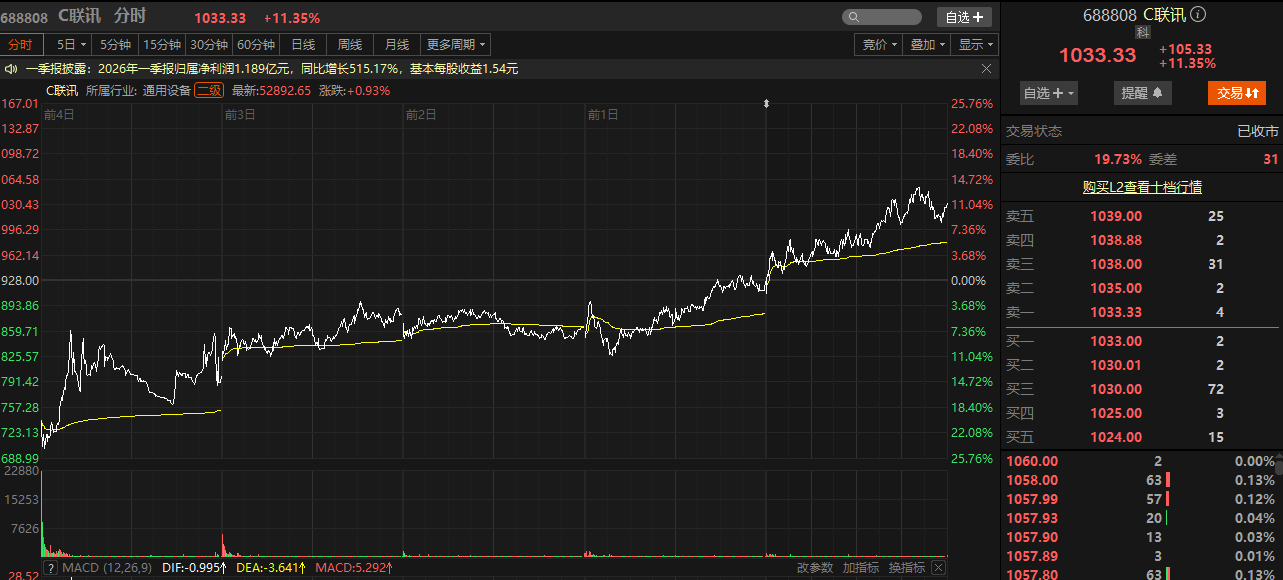 《科创板日报》记者注意到,本轮千元股行情的主角,清一色为硬科技企业。2025年8月,AI芯片供应商寒武纪盘中股价突破千元,成为A股历史第七只千元股;2026年3月,光芯片龙头源杰科技盘中站上千元关口,跻身第八只千元股。时隔仅一个多月,联讯仪器再接棒登场,成为A股第九只千元股。