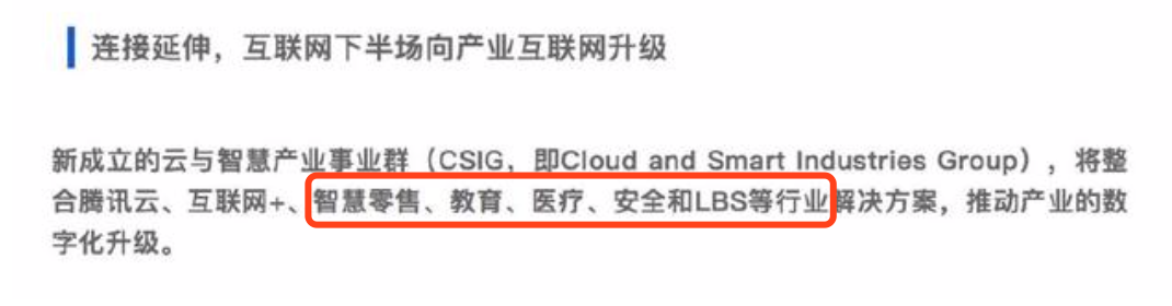 财联社记者注意到,腾讯CSIG在描述其业务目标时,将“智慧零售”排在行业场景的最前面,由此可见腾讯对于智慧零售(新零售是阿里集团对外用词)的重视程度。