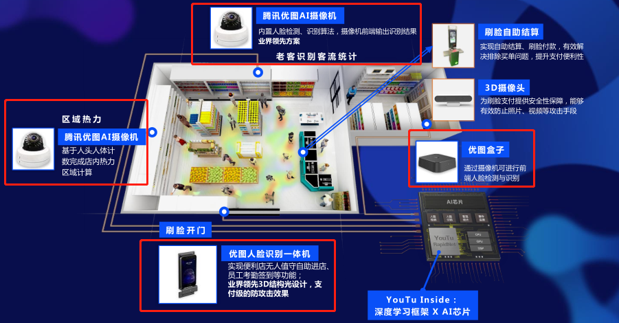 图|腾讯优图AI摄像机、优图人脸识别一体机和优图盒子在线下门店的布局
