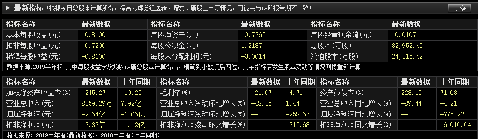 公司经营状况同样不容乐观。数据显示,暴风集团2019年上半年实现营业收入8359.29万元,同比下降89.44%;净利润为-2.64亿元,而去年同期为-1.06亿元。此外,经营活动产生的现金流量净额、基本每股收益均大幅下滑,归属于上市公司股东的净资产为-2.39亿元。如果暴风集团不能改善当前的状况,导致2019年末的净资产为负,公司股票则存在被暂停上市的风险。