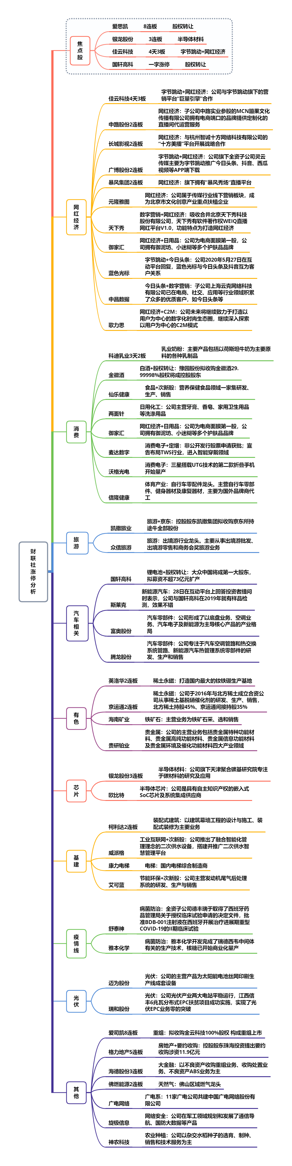 网红经济概念今天掀起涨停潮,板块超10家涨停。消息上,除受电商618活动预期及抖音4月吸金暴增10倍消息刺激外,据知情人士在28日透露,这几个月入驻抖音小店的商家数量激增,目前已逼近了百万级别。同时,抖音小店的电商系统正在筹备上线新的产品——鲁班选品,目的是想通过这个产品来加强对供应链的管控。网红经济概念走强的同时,共享单车、白酒、食品加工、消费电子、日用品等消费板块联动走强。