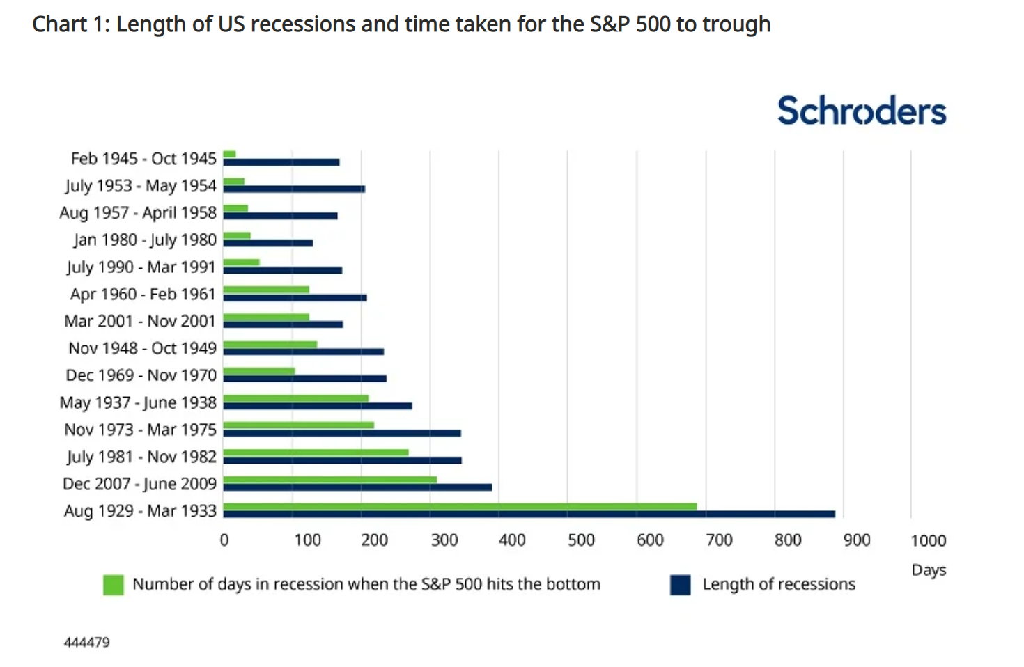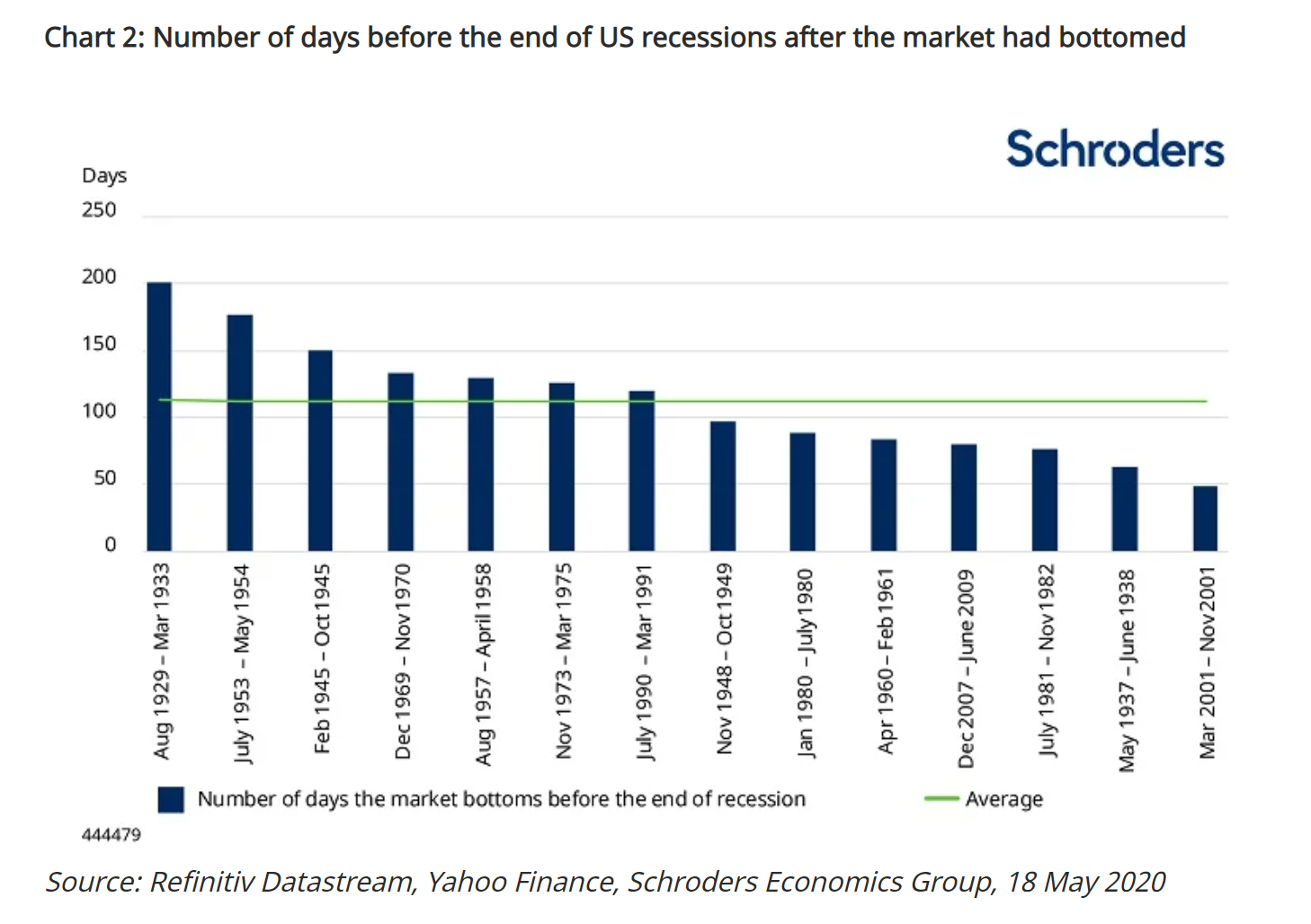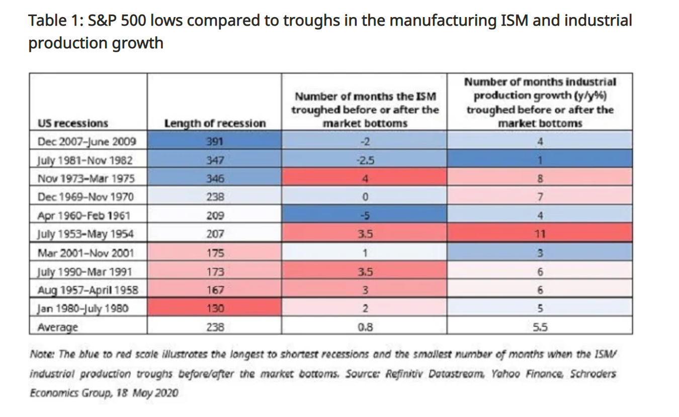 2.施罗德指出,衰退持续时间通常有很大的一致性,经济通常在市场触底后平均3.5个月(113天)左右走出衰退。如果假设美国目前的衰退将在2021年之前结束,那么以史为鉴,市场目前还没有触底。