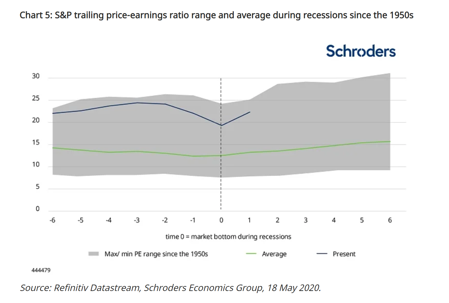 与以往市场触底时的衰退相比,美国股市的市盈率更高。这表明,如果没有盈利的支持,标普更容易受到市盈率下调的影响。不过施罗德指出,鉴于美联储前所未有的货币政策行动,市盈率仍将比以往衰退期间的市场低谷高。因此,美联储是阻止市场再次测试3月份低点的关键因素之一。