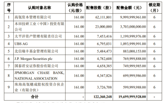 《科创板日报》(上海,研究员 何律衡)讯,本周五(17日)晚间,宁德时代公布非公开发行股票发行结果,募资总额197亿元。其中,高瓴资本认购100亿元,本田认购37亿元,珠海高瓴穗成股权投资合伙企业(有限合伙)认购6亿元。