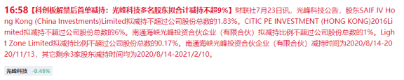 最先出消息的是科创板第一批公司光峰科技,多名股东拟合计减持不超9%。按照光峰科技最新的收盘价计算,这笔减持高达近11亿元。