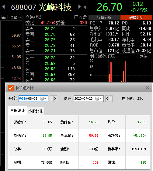 从上市一年以来,光峰科技股价跌跌不休,从8月6日最高价已腰斩。