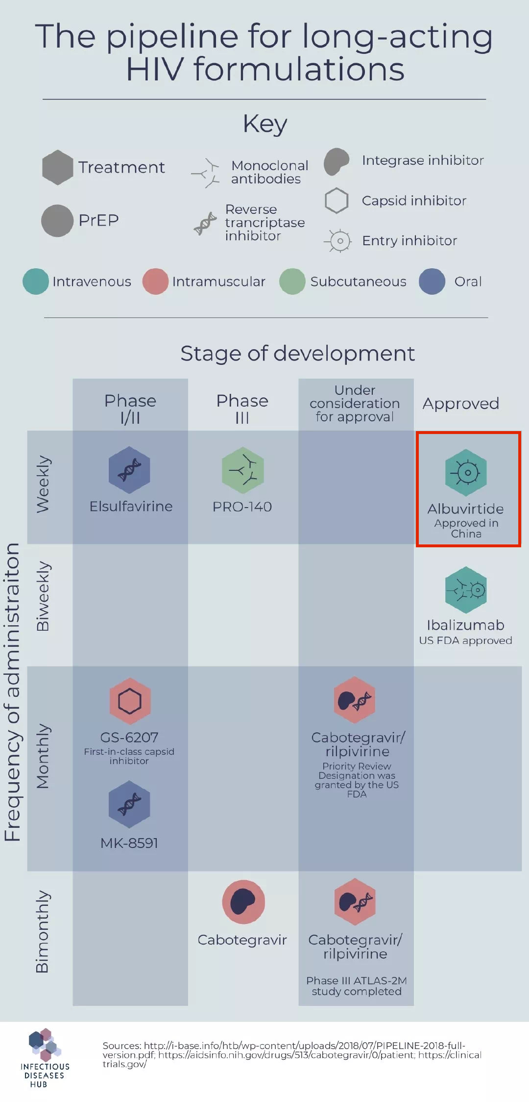 其中艾可宁每周注射一次,与其它抗艾药物联用,治疗已接受过抗病毒药物治疗的HIV-1感染者;ibalizumab每两周注射一次,也需与其他抗逆转录病毒疗法(ARTs)联用。