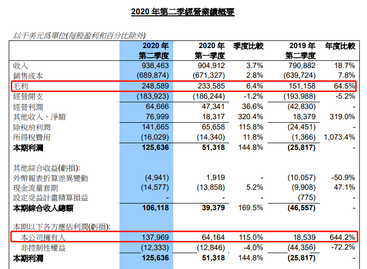 此外,公司第二季度毛利为2.49亿美元,环比增长6.4%,同比增长64.5%。归属于公司的应占利润为1.38亿美元,环比增长115%,同比增长644.2%。