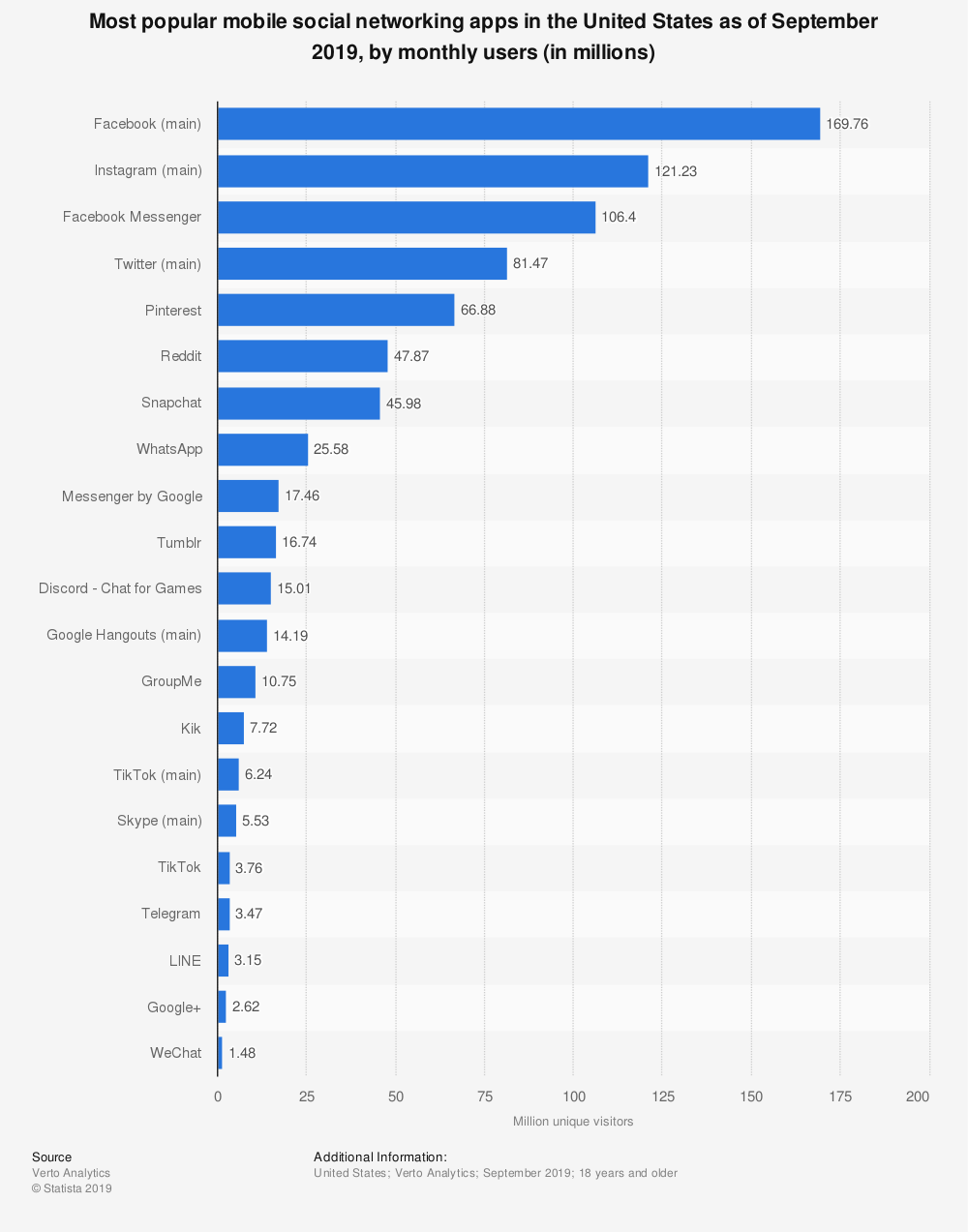 根据统计机构Statista的数据显示,美国主流的社交App为Facebook、Instagram以及Twitter,Facebook的月活用户达1.697亿。而WeChat在美国排名20开外,月活用户在1480万。