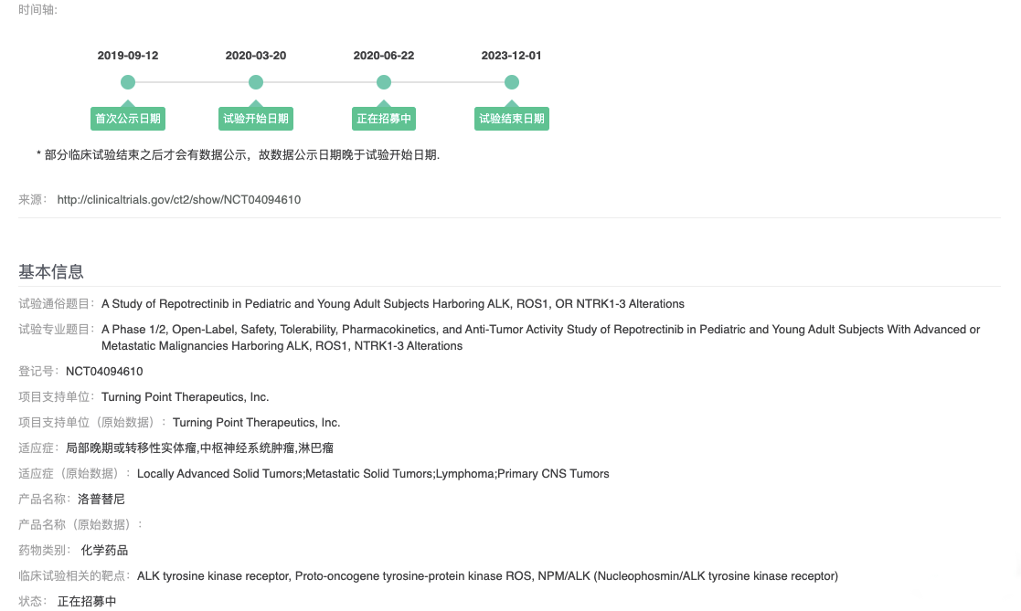 就全球ROS1/NTRK小分子抑制剂药物的研发进展来看,《科创板日报》记者查询GBI SOURCE数据库,目前还有新一代口服小分子ALK/ROS1/NTRK抑制剂Repotrectinib已进入Ⅰ/Ⅱ期临床,适应症为局部晚期或转移性实体瘤、中枢神经系统肿瘤、淋巴瘤。项目支持单位为美国临床阶段生物制药公司Turning Point Therapeutics。