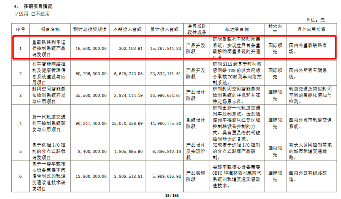 此外,公司在研项目中,重载铁路列车运行控制系统产品研发项目也赫然在列,项目拟达到目标为研制重载列车移动闭塞系统,实现世界首条重载移动闭塞系统的开通运营,预计总投资规模达到1650万元,目前已进入产品开发阶段,技术水平国际领先,具体应用前景为国内外重载铁路市场。