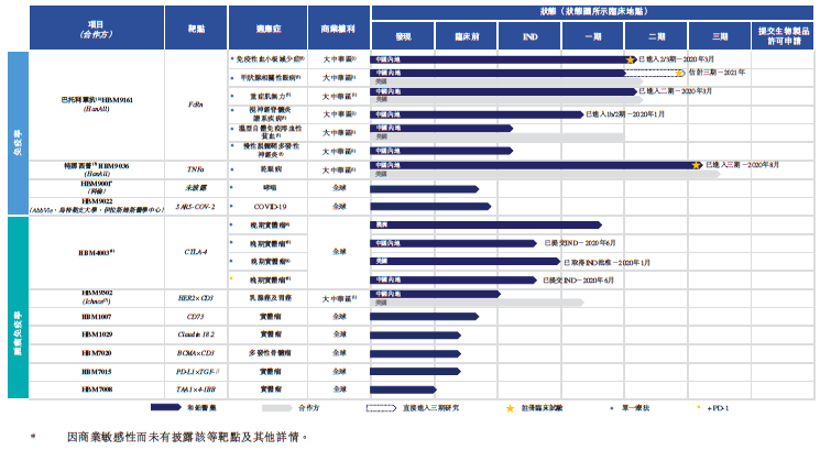 截至目前,和铂医药有6个项目进入临床阶段,包括FcRn抑制剂巴托利单抗(HBM9161)、TNF-α抑制剂特那西普(HBM9036)、抗CTLA-4抗体HBM4003、HER2/CD3双特异性抗体HBM9302等。