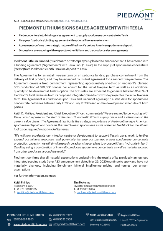 财联社(上海,编辑 黄君芝)讯,澳大利亚锂矿公司Piedmont Lithium周一(28日)宣布,其与美国电动汽车巨头特斯拉签署了一份初定期限为5年的合作协议,该公司将向特斯拉供应从其北卡罗莱纳州的矿床中开采的高纯度锂矿石。