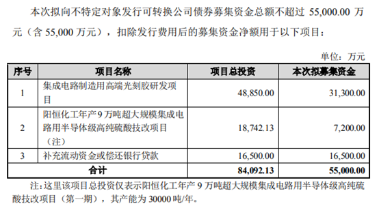 《科创板日报》(深圳,记者 莫磬箻)讯,9月29日早间,晶瑞股份(300655.SZ)发布公告称,公司拟向不特定对象发行不超5.5亿元可转债,用于集成电路制造用高端光刻胶研发项目、阳恒化工年产9万吨超大规模集成电路用半导体级高纯硫酸技改项目、补充流动资金或偿还银行贷款,分别投入3.13亿元、7200万元和1.65亿元。(注:三大项目总投资8.41亿元,其中使用募投资金5.5亿元)