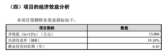 根据经济效益分析,该项目的静态投资回收期为6.43年,内部收益率(IRR)达到19.10%。
