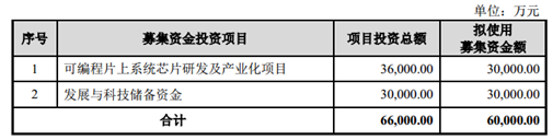 招股书显示,本次科创板IPO,复旦微拟募集6亿元,其中3亿元用于投入“可编程片上系统芯片研发及产业化项目”,另外3亿元则用于发展与科技储备资金。
