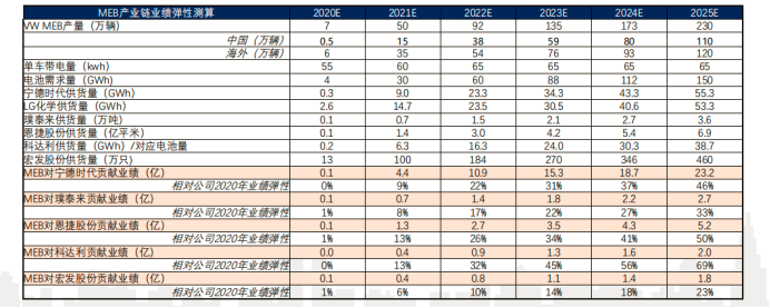 根据兴业证券分析师曾英捷8月7日报告预计,2025年大众MEB产销230万辆,2020-2025年复合增速104%。同时,以公司2020年业绩为基准,预计2025年大众MEB将给产业链宁德时代、璞泰来、恩捷、科达利、宏发股份带来46%、33%、50%、69%、23%业绩弹性,贡献23、2.7、5.2、2.0、1.8亿利润。