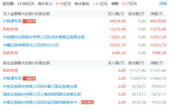 盘后龙虎榜数据,北向资金爆买,机构大手笔做T,全天资金净流入5.57亿。席位方面,买一北向资金买入4.41亿,同时卖二卖出1.17亿;买二、卖三机构席位合计买入2.47亿,同时卖一卖出1.17亿。