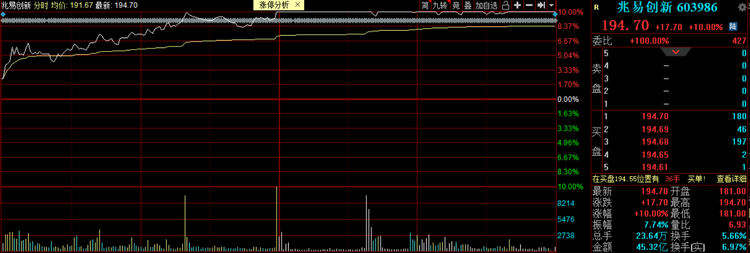 早盘,兆易创新高开2%,随后股价一路震荡走高,临近午盘封上涨停,午后虽多次开板,但资金承接有力,截至收盘,报194.70元,成交额超45亿。盘中韦尔股份、捷捷微电、北方华创等个股也纷纷大涨。