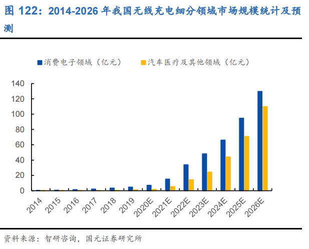 消费电子、电动汽车、医疗设备等领域中,目前无线充电市场仍由消费电子主导,但据咨询机构预测,汽车医疗及其它领域的无线充电市场也有望在未来实现大幅增长。