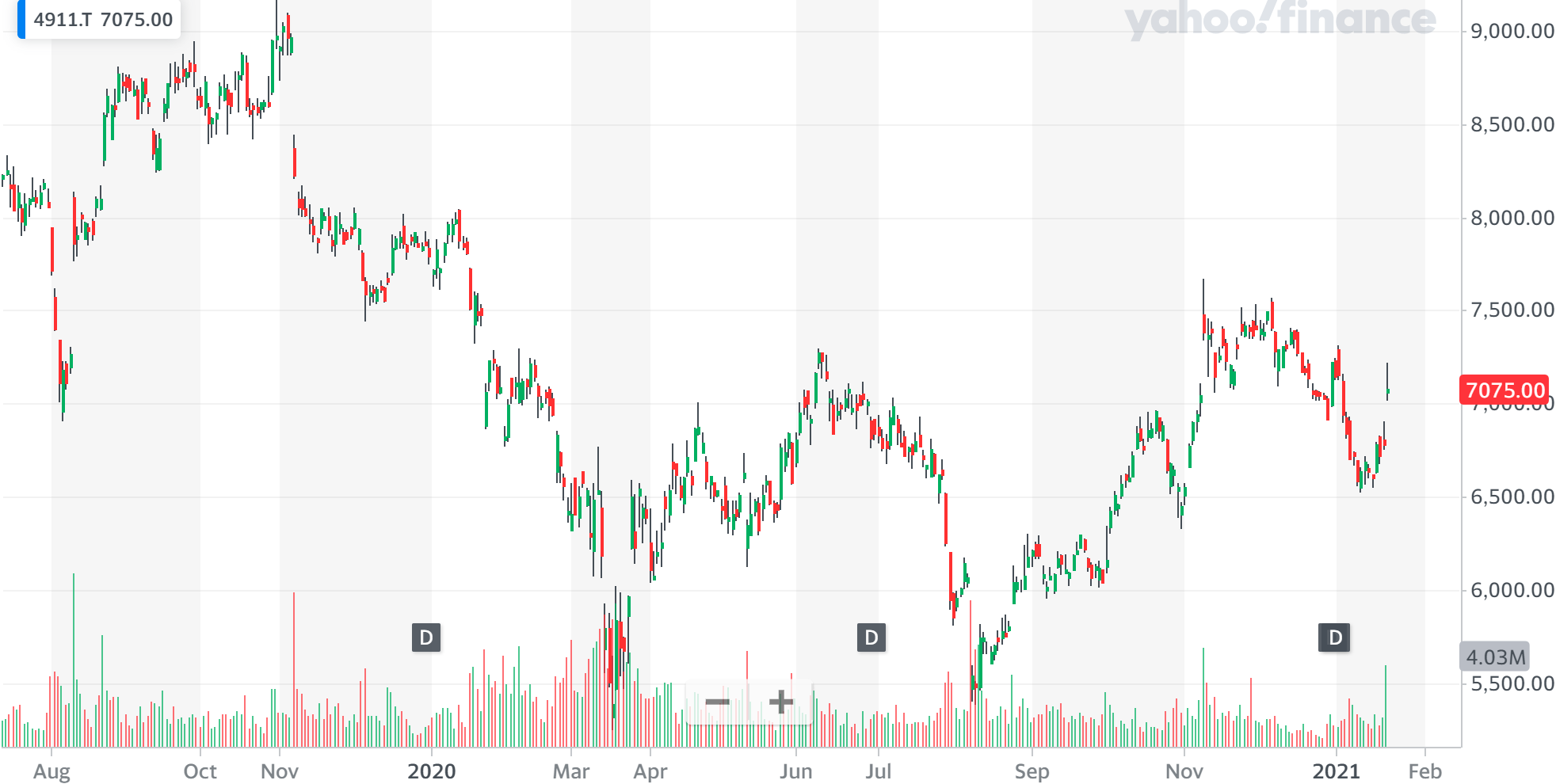 受公告信息提振,周五资生堂收盘涨4.43%,报7075日元。