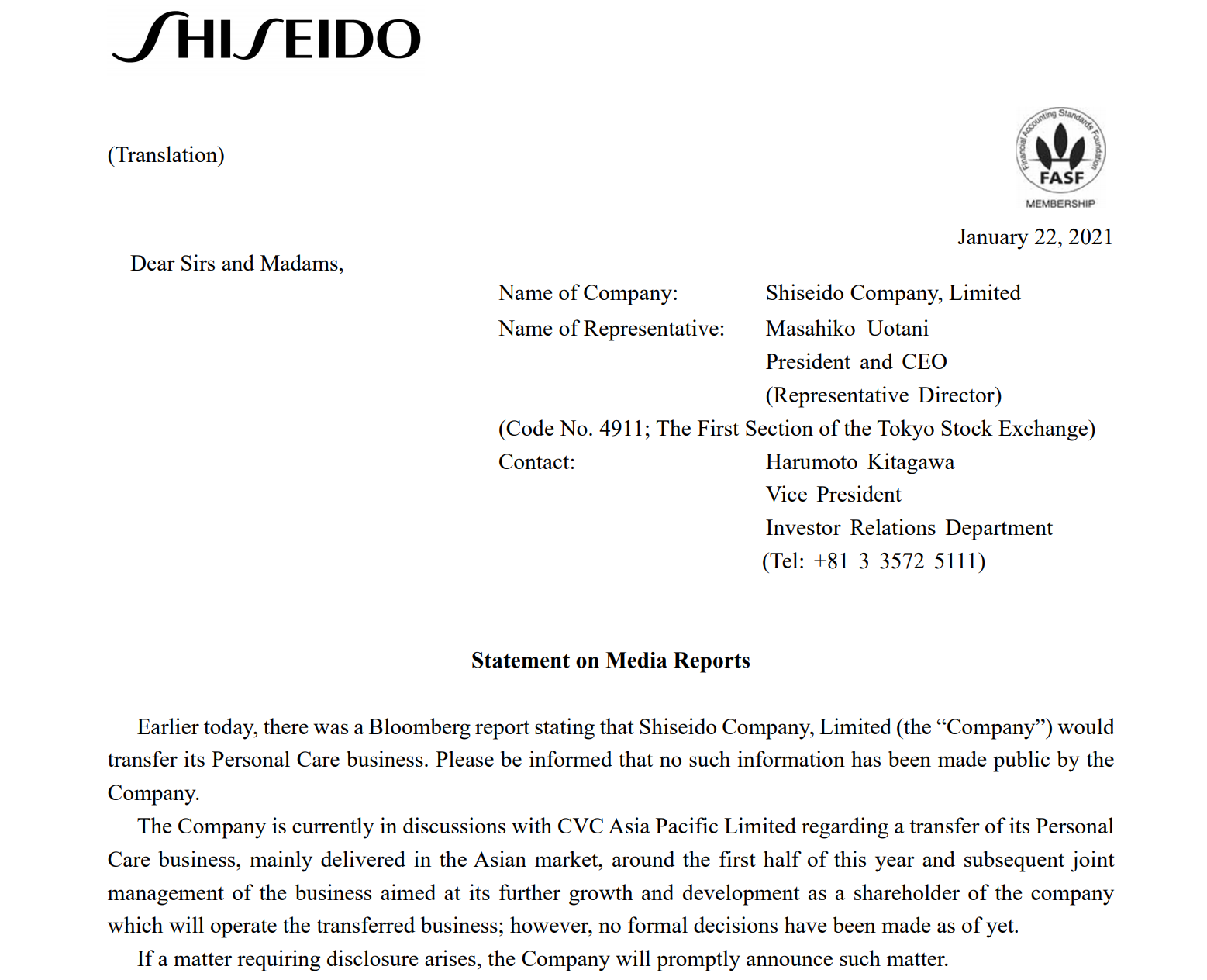 财联社(上海,编辑 史正丞)讯,当地时间周五,知名日用品公司资生堂(4911.T)发布公告,确认了有关公司正洽谈出售部分个护品牌的传言。