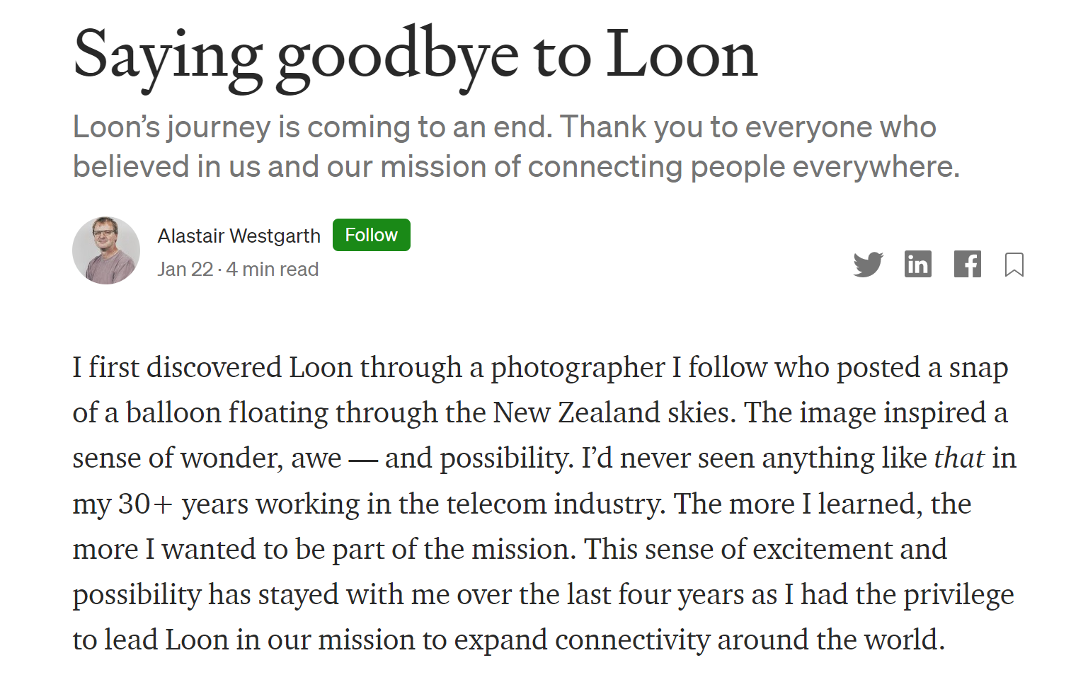 Loon首席执行官Alastair Westgarth表示,创业过程中虽然讨论了许多如何连接10亿用户的方法,但事实是Loon试图解决的是最难的问题:连接全球“最后的10亿人”。这些社区要么太过偏远/太难触达,或使用现有技术提供实时通讯过于昂贵。十年来虽然有一系列合作伙伴一同前行,但我们始终未能找到建立长期可持续业务且成本足够低的模式。很遗憾地宣布Loon将就此关闭。