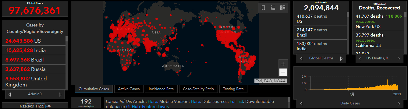 财联社(上海,编辑吴斌)讯,美国约翰斯·霍普金斯大学发布的统计数据显示,截至北京时间1月22日23时22分,全球新冠肺炎确诊病例上升至97,676,361例,其中死亡病例达到2,094,844例。按照目前全球每天约60万人感染的速度,下周初全球累计确诊病例就将突破1亿。