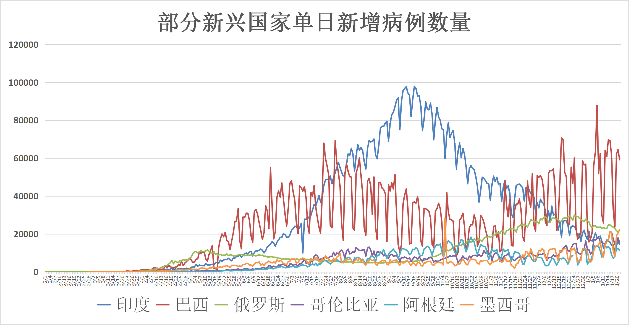 主要新兴市场国家中,印度(10,625,428例)、巴西(8,697,368例)、俄罗斯(3,637,862例)疫情严重。美洲哥伦比亚(1,972,345例)、阿根廷(1,843,077例)、墨西哥(1,711,283例)疫情亦不容乐观。