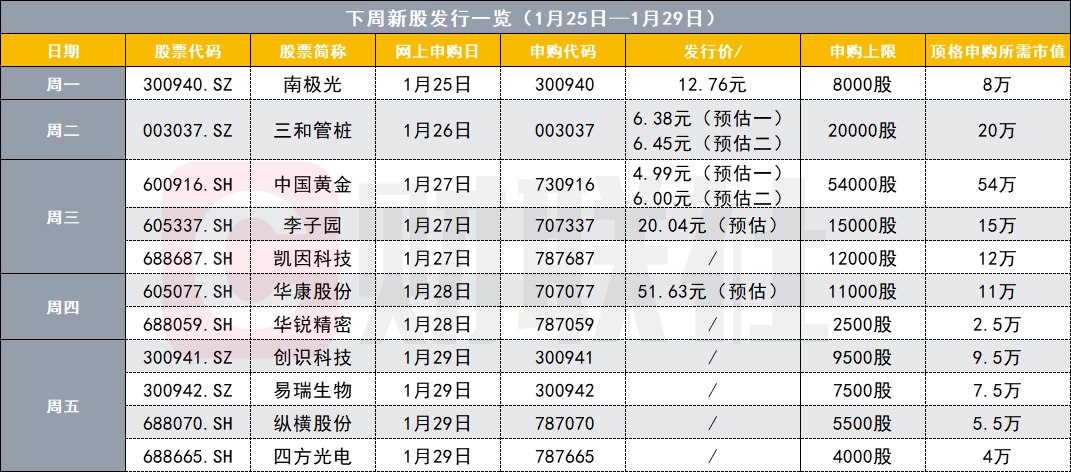 财联社1月24日讯,根据新股发行安排,下周A股将有11只新股申购,申购日期主要集中在周三和周五。分板块来看,包括沪市主板3只、科创板4只、中小板1只、创业板3只。