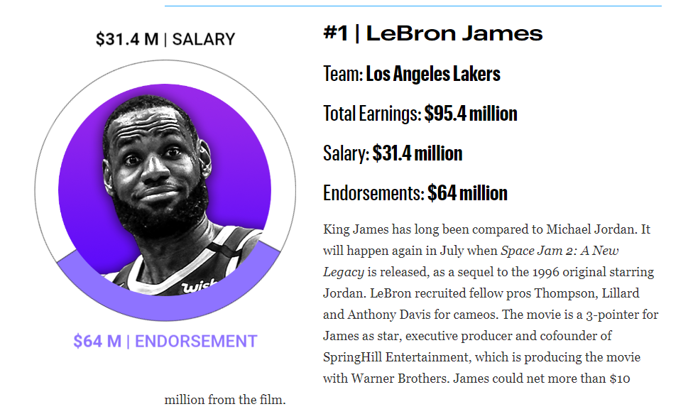 其中被业内称之为詹皇的洛杉矶湖人球员勒布朗·詹姆斯,这一年的预估收入达9540万美元,连续第七年位居榜首,继续成为NBA最赚钱的球员。其近亿美元收入中,有6400万美元来自代言、纪念品和媒体收入,个人工资收入达3140万美元。