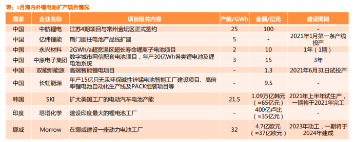 天风证券邹润芳团队2月1日报告指出,从建设周期看,多数项目为分期建设,首期项目多于2021年内建成或试投产,基本在2024年之前完全建成。从1月的扩产项目可以看出,一方面目前头部企业仍为扩张主力,中航锂电和亿纬锂能扩产产能超过30GWh;另一方面,海外企业正在加速追赶,产能规模加大。