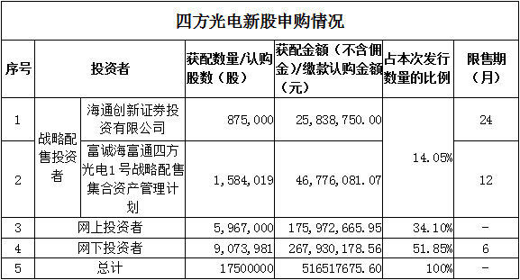据悉,2020年1月29日,四方光电开启新股申购,采用战略配售、询价配售和定价发行三种相结合的方式,包括向战略投资者定向配售(以下简称“战略配售”)、网下向符合条件的网下投资者询价配售(以下简称“网下发行”)和网上向持有上海市场非限售A股股份和非限售存托凭证市值的社会公众投资者定价发行(以下简称“网上发行”)。