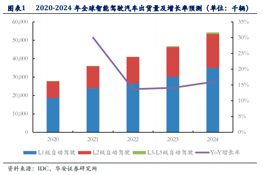 根据IDC的预测,2024年全球L1-L5级自动驾驶汽车出货量预计将达到约5425万辆,2020至2024年的年均复合增长率(CAGR)达到18.3%;L1和L2级自动驾驶在2024年的市场份额预计分别为64.4%和34.0%。L3-L5级自动驾驶技术的应用具有开拓性意义,L1-L2级辅助驾驶会是未来5年内带动全球自动驾驶汽车出货量增长的最大细分市场。