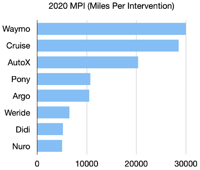 数据显示,前三名的Waymo、Cruise与AutoX的MPI均在2万英里到3万英里区间(约3万公里到5万公里),分别为29945英里、28520英里和20367英里;小马智行和Argo在1万英里左右。