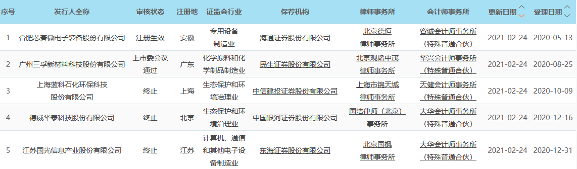 截至2月24日晚,共有540家公司科创板上市申请获受理,5家公司发审状态更新:蓝科环保、德威华泰、国光信息终止;三孚新科上市委会议通过;芯碁微装注册生效。