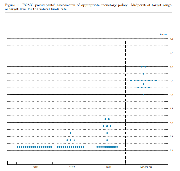 财联社(上海,编辑 吴斌)讯,北京时间周四凌晨2点,美联储如预期般维持近零利率不变,同时大幅提高了美国经济和通胀预期。尽管经济前景改善且今年通胀上行,美联储仍预计到2023年都不会加息。