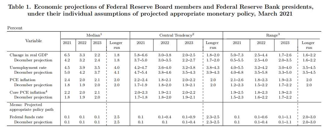 美联储大幅上调了今年美国经济预期,预计2021年GDP将增长6.5%,而去年12月仅预测为4.2%。随着GDP增长,美联储预计今年失业率将从目前的6.2%降至4.5%,相比之下,去年12月预测为5%。2022年和2023年的失业率预测分别为3.9%和3.5%。