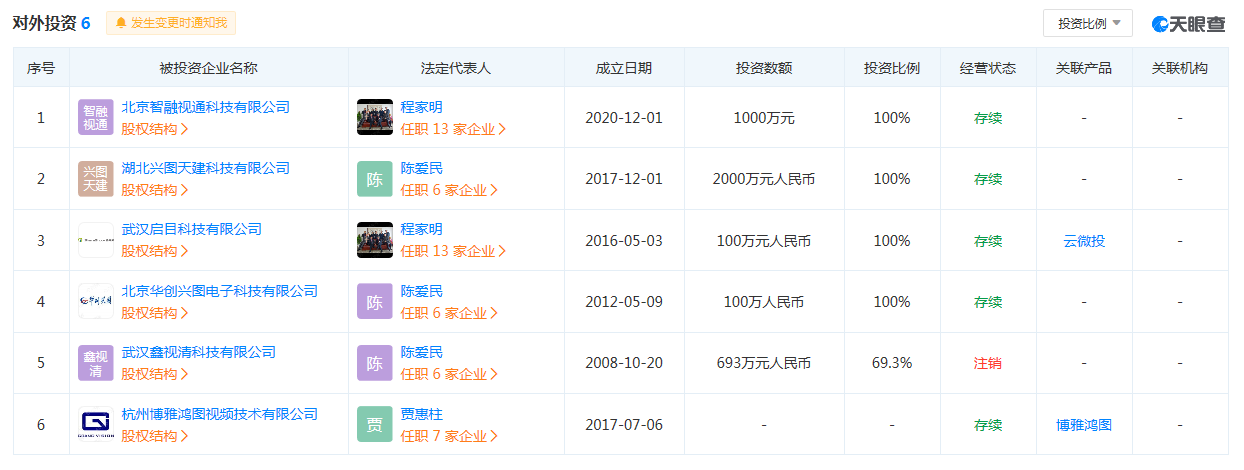根据天眼查信息,兴图新科对外投资的企业有6家,其中4家为100%控股,1家已注销,还有一家则为新投资参股的杭州博雅鸿图。