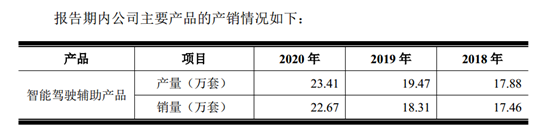 从招股书披露来看,智能辅助驾驶产品为远峰科技最大业绩来源——营收占比达到52.71%;毛利占比为 69.98%、(小K注:均为2020年度数据)。2018-2020年度,公司智能辅助驾驶产品销量分别为17.46万套、18.31万套和22.67万套,价格约为2000元/套。