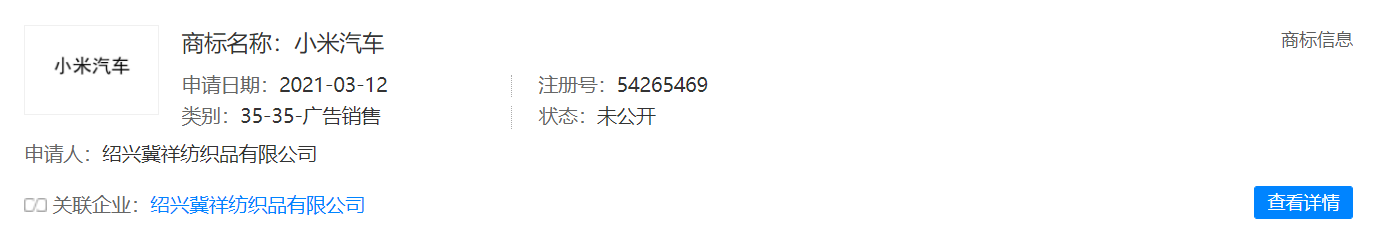 不过,《科创板日报》记者通过查询天眼查发现,今年3月12日,“小米汽车”的商标已被绍兴冀祥纺织品有限公司所抢注。