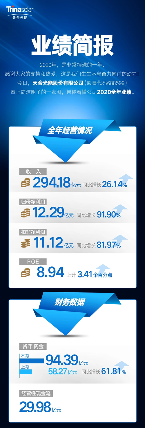 天合光能于3月30日晚发布2020年年报,公司2020年实现营收294.18亿元,同比增长26.14%;同期归母净利润为12.29亿元,同比增长91.90%,扣非归母净利润为11.12亿元,同比增长81.97%。每股收益0.64元,加权平均ROE为8.94%,上升3.41个百分点。拟每10股派1.8元(含税),预计拟派发现金红利达3.72亿元。