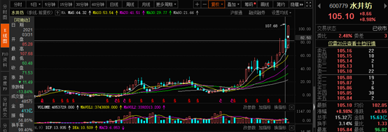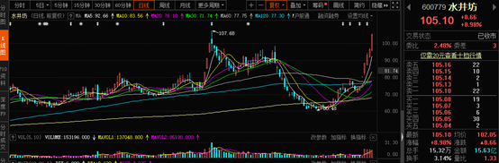 今日白酒板块强劲反弹,板块大涨近4%,老白干酒等多股涨停,不过对于白酒股来说,近期表现最为亮眼的莫过于水井坊,该股今日大涨近9%,股价重返百元关口上方,距离历史新高仅一步之遥。