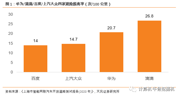 幸运的是,我们从《上海市智能网联汽车开放道路测试报告(2020年)》找到了相关测试结果,其中公认相对实力较强的华为/滴滴/百度/上汽大众情况如下。从避险脱离率来看,四家自动驾驶水平处于同一水平(14~26.8),从20年情况来看暂时未呈现非常本质的区别。