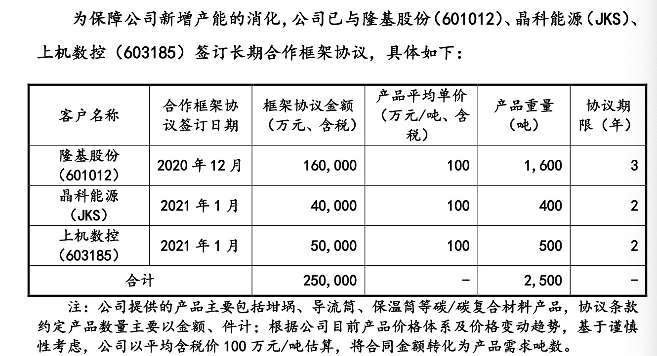 公开资料显示,金博股份已与隆基股份(601012.SH)签、晶科能源(JKS)、 上机数控(603185.SH)签订长期合作框架协议。其中与隆基股份约定3年采购1600吨,与晶科能源和上机数控则约定2年内分别采购400吨和500吨。