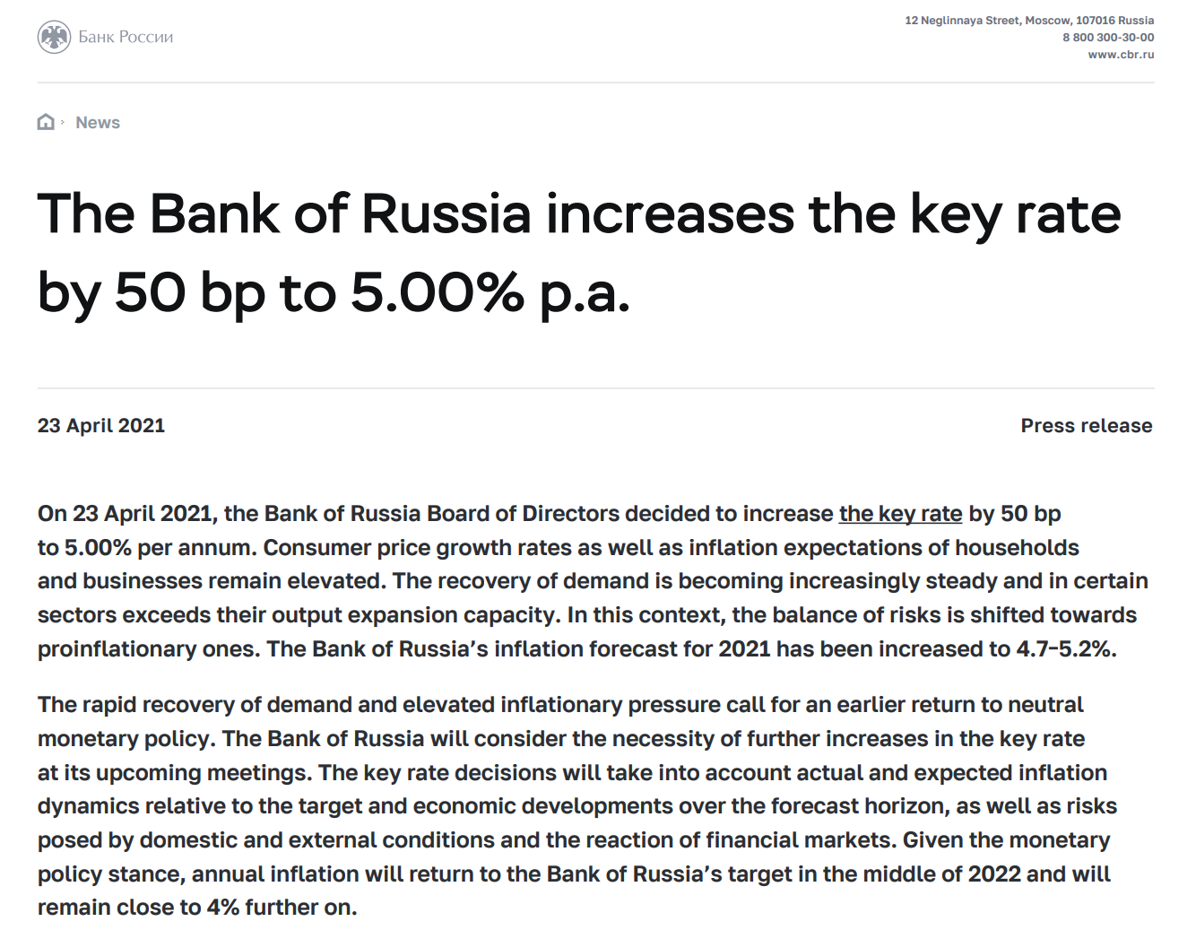 财联社(上海,编辑 史正丞)讯,当地时间周五,在经济复苏和通胀预期同步上行的推动下,俄罗斯央行宣布加息50个基点至5%,超过此前市场加息25个基点的预期。考虑到俄央行上个月才刚刚启动货币政策正常化进程,市场普遍预期年内仍会有进一步动作。俄罗斯央行的下一次政策会议将在6月11日举行。