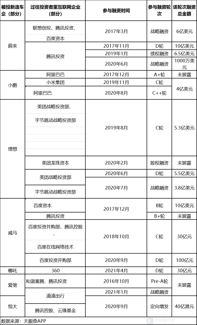 《科创板日报》记者通过梳理公开资料发现,在众多造车新势力的投资者名单里,不乏互联网巨头的身影。