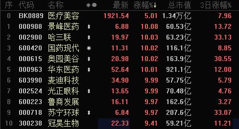 截至发稿,今日医美股再掀涨停潮,哈三联3连板,奥园美谷2连板,景峰医药等10股涨停,贝泰妮再创新高。趋势股朗姿股份、华东医药等个股均表现抢眼。