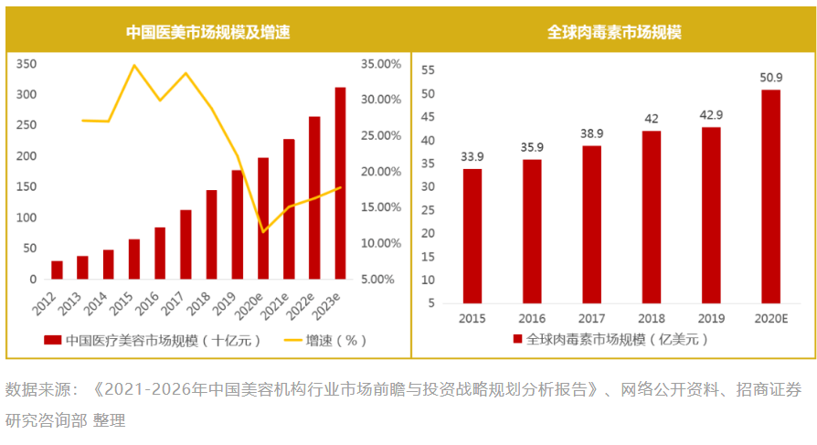 关于医美板块最新的机遇,国元证券认为来自注射类医美。2021年4月13日,华东医药公告英国全资子公司Sinclair“少女针”产品Ellanse-S正式获批,并已准备好上市相关推广工作,预计将于2021年下半年在中国大陆正式上市销售。该事件迅速引爆市场热情,“少女针”、“童颜针”等相关产品获得了极高的关注度,考虑其对现有产品的补充、升级作用,未来有望在陆续获批上市后成为注射类医美市场新的发展机遇。